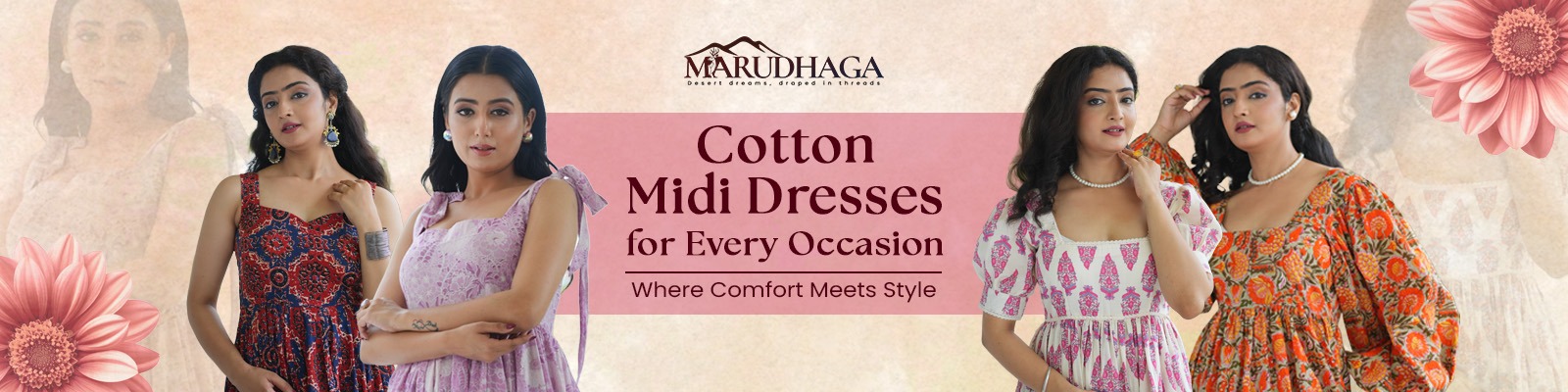 Celebrities, YouTubers, and even influencers are capturing their summer cotton midi dress look with boho-inspired bags. You will find these colorful boho bags anywhere near Jaipur city. Very lightweight and ethnic-looking bags are a must with any cotton bloom dress. Hopefully, your confusion is clear about how to style midi dress. But wait, it's time to explore the trendy midi dress collection from Marudhaga's official website.Trendy Cotton One-piece Dress for Women for Every Mood