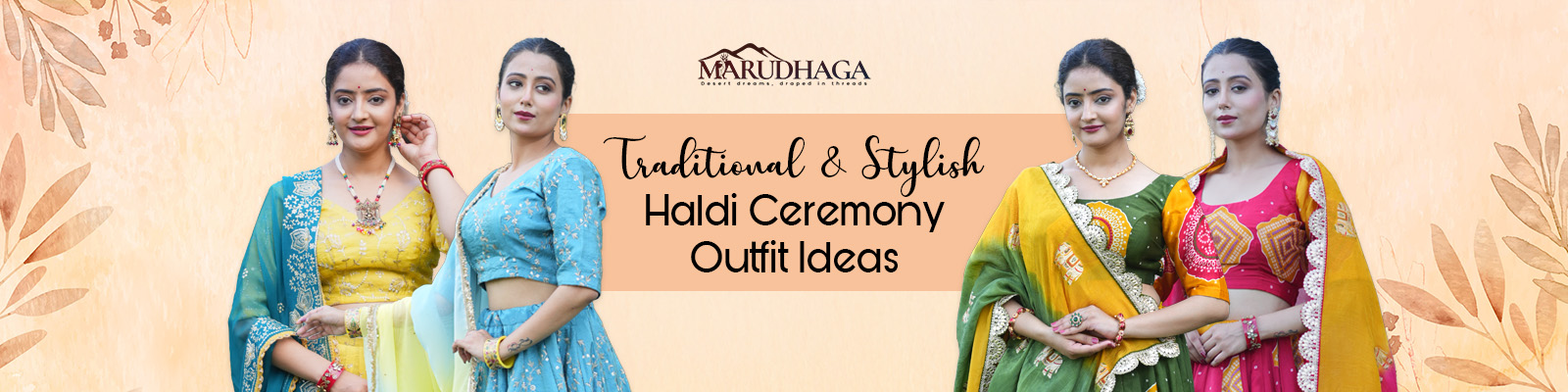 what to wear for the Haldi ceremony? It is one of the crucial wedding function rituals, where the bride and groom are covered with turmeric paste, as it is considered good luck for their big wedding day. The Haldi function is a daytime event, and choosing an outfit that shines in the sunlight and offers comfort and ease plays a significant role. Since the Haldi function is one of the most enjoyable rituals in wedding ceremonies, your outfit must also carry that same vibe. From stunning yellow lehengas, anarkali, and sharara to modern trend cord sets, your haldi outfit must create a photogenic moment. Thus, in this informative blog, we will walk you through every aspect of what to look for when buying Haldi outfits. Whether you are a bride, bridesmaid, best friend, or sister, choose your haldi event style with Marudhaga only.