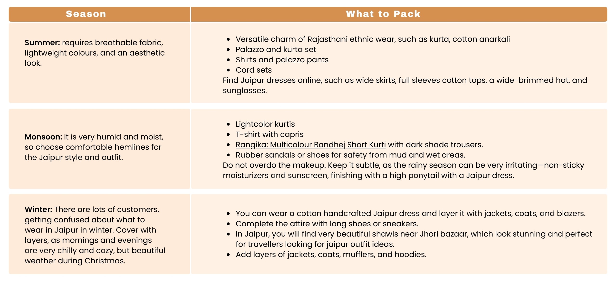 Visiting Jaipur for those cultural evenings, majestic forts, and colourful narrow lanes will surprise you every time you walk in. Thus, through this guide, we hope that with these recommended Jaipur outfit ideas, you will feel comfortable, connected to Jaipur's dressing style, city vibes, and enjoy every moment. Remember, when you start packing, first gather the must-have essentials, and pack your outfits considering the weather conditions.