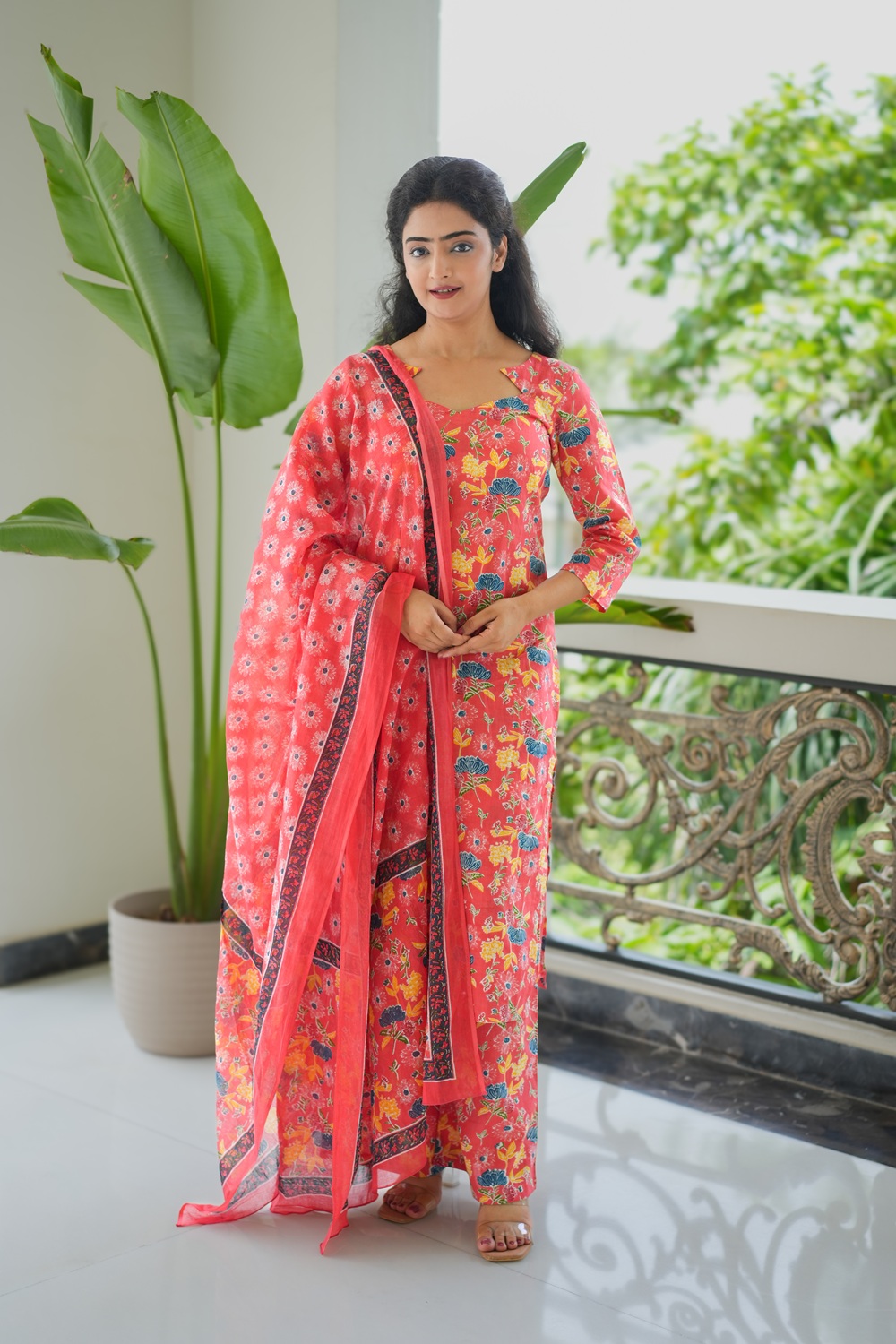 The matching dupatta completes the ensemble with a coordinated charm, adorned with contrast floral motifs and a printed border that lends structure and style. Lightweight and easy to carry, this suit set is perfect for daytime outings, casual celebrations, or festive summer gatherings.