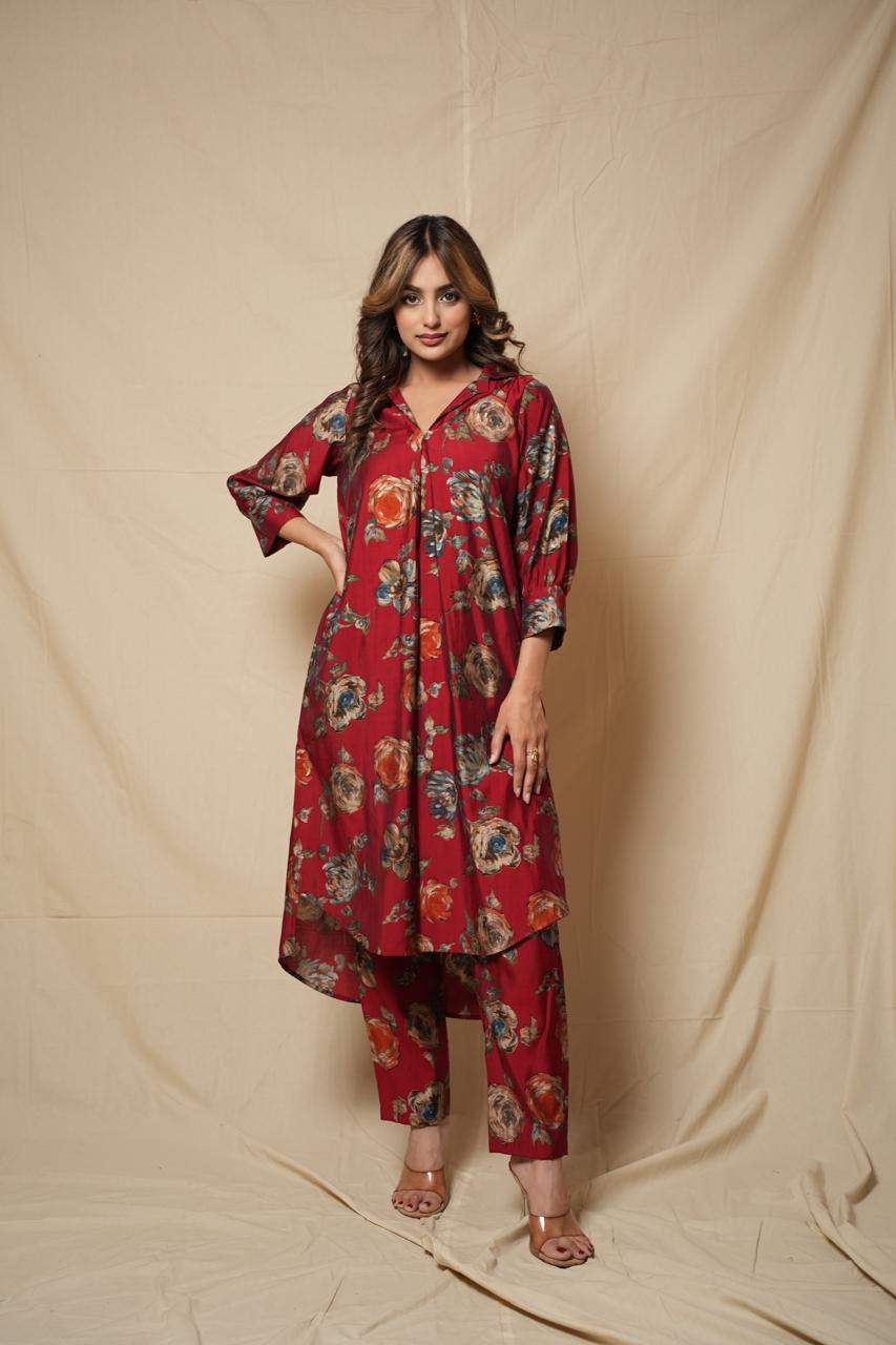 Available in two versatile shades—rich maroon and warm mustard—this set brings a refreshing floral charm to your wardrobe while keeping it work-appropriate and polished.