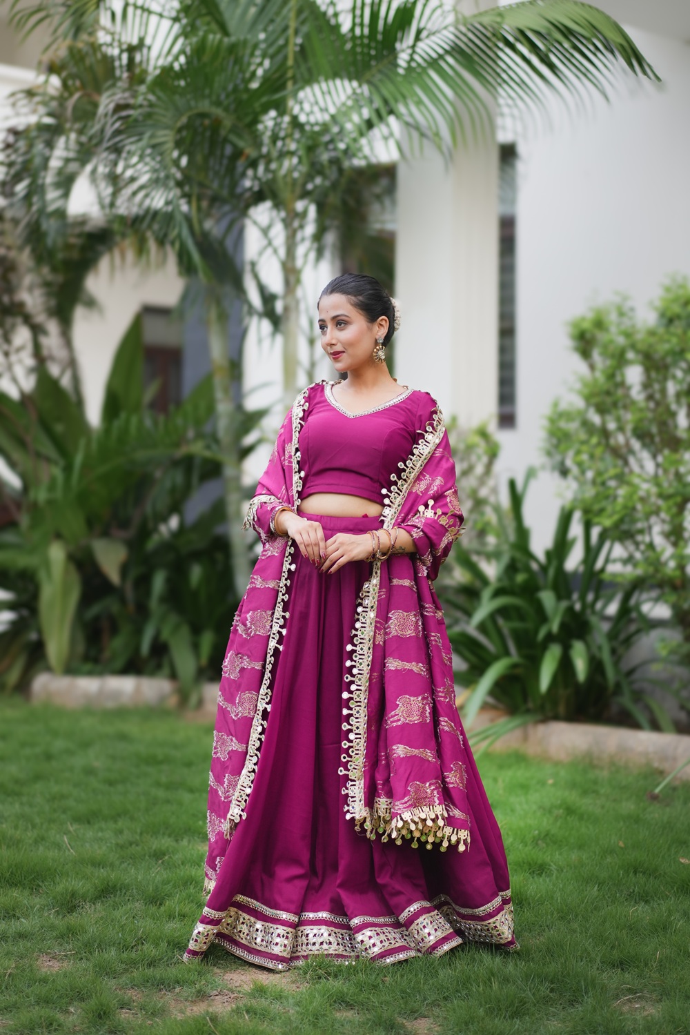 The MADHUBALA MIRROR LACE LEHENGA SET is a stunning ensemble that exudes elegance and sophistication. The wine-colored lehenga is intricately adorned with mirror lace work, creating a dazzling effect that catches the light. Paired with a matching blouse and dupatta, this set is perfect for special occasions like weddings, receptions, or formal events. The combination of rich color and exquisite embellishments makes this lehenga set a true showstopper, sure to turn heads wherever you go. Whether you're a bride, bridesmaid, or guest, the MADHUBALA MIRROR LACE LEHENGA SET will make you feel like royalty.