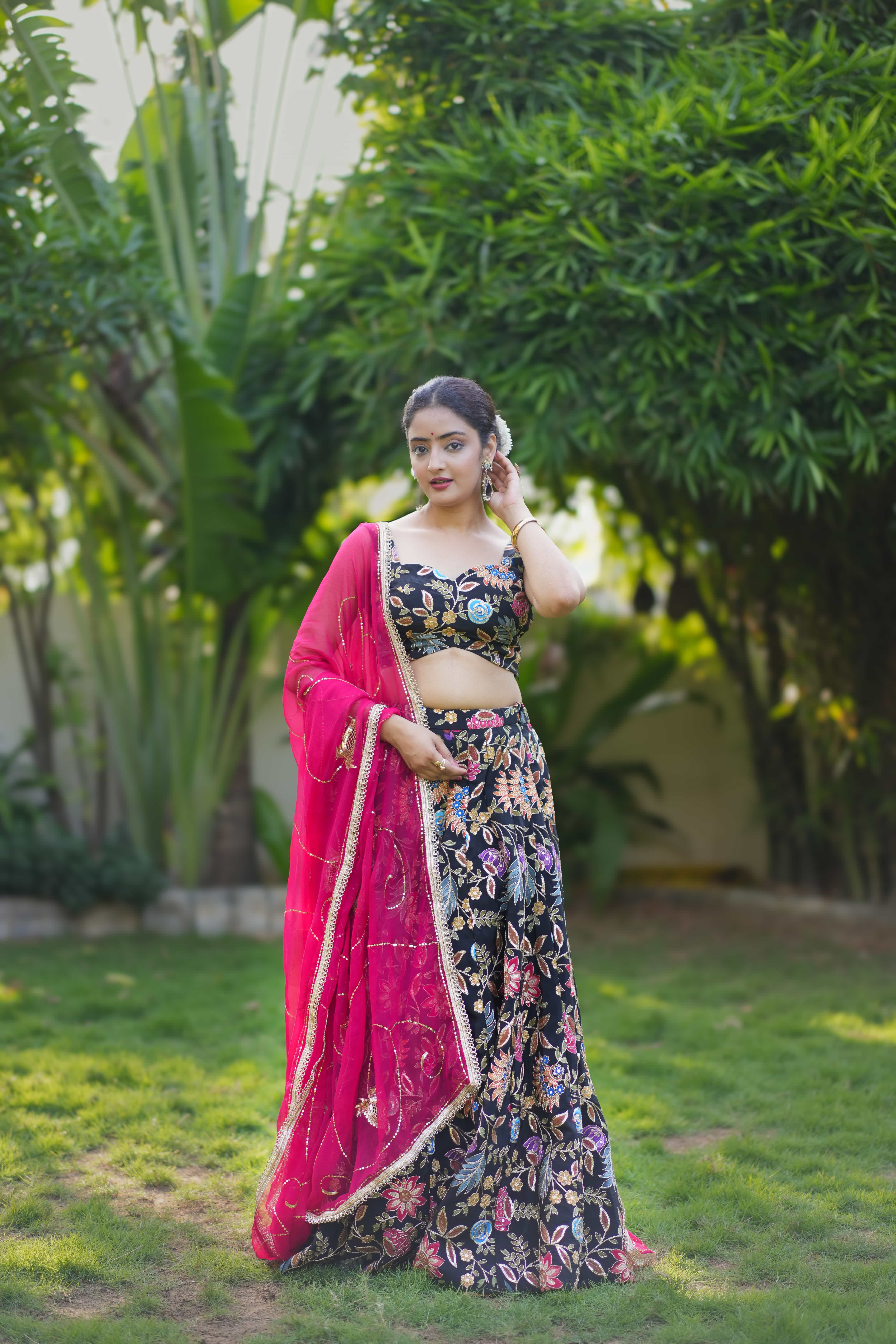 classy and bold aesthetics. Straight out of fresh festive collection this black multicolor lehenga