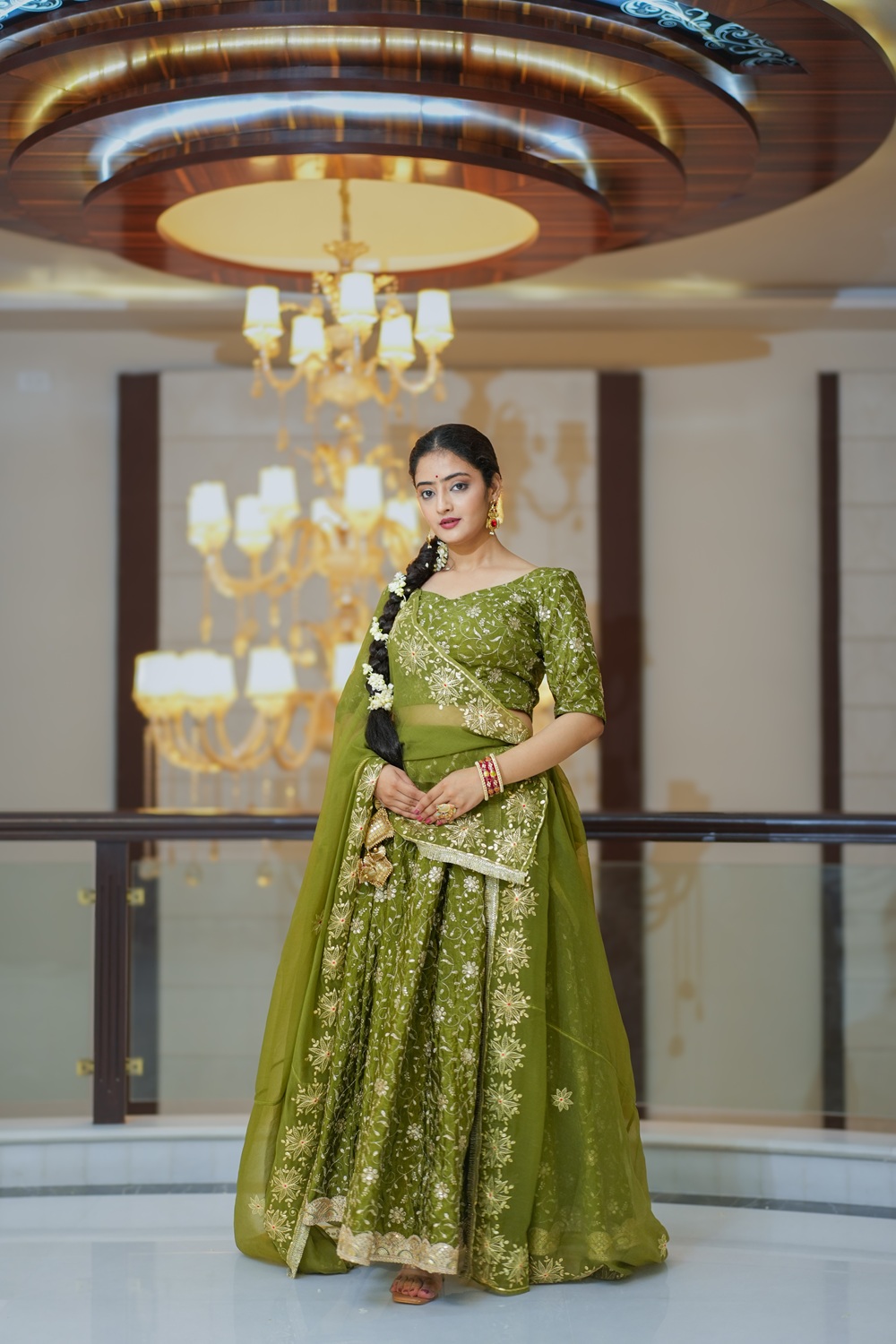 Draped in a rich olive hue kissed with golden undertones, this lehenga is ideal for weddings, receptions, and festive soirées. Pair it with traditional polki jewelry and embellished juttis for a classic bridal look, or style it with statement earrings and heels for a contemporary regal charm.
