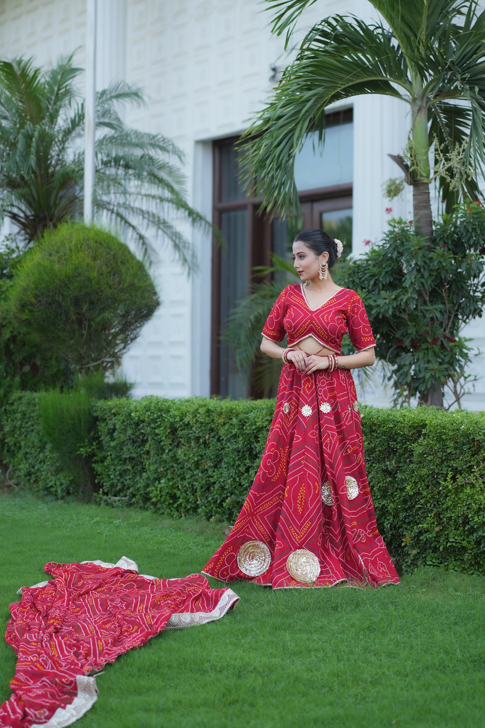 The "Rajasthani Rani" is a stunning georgette lehenga set adorned with traditional Rajasthani gota work. The lehenga features intricate gota embroidery with gold accents and patterns, giving it a rich and festive look typical of Rajasthani attire. A matching dupatta with a border complements the lehenga, adding to the overall elegance. Perfect for cultural events, weddings, or festivals, this outfit showcases the beauty of traditional Rajasthani craftsmanship.