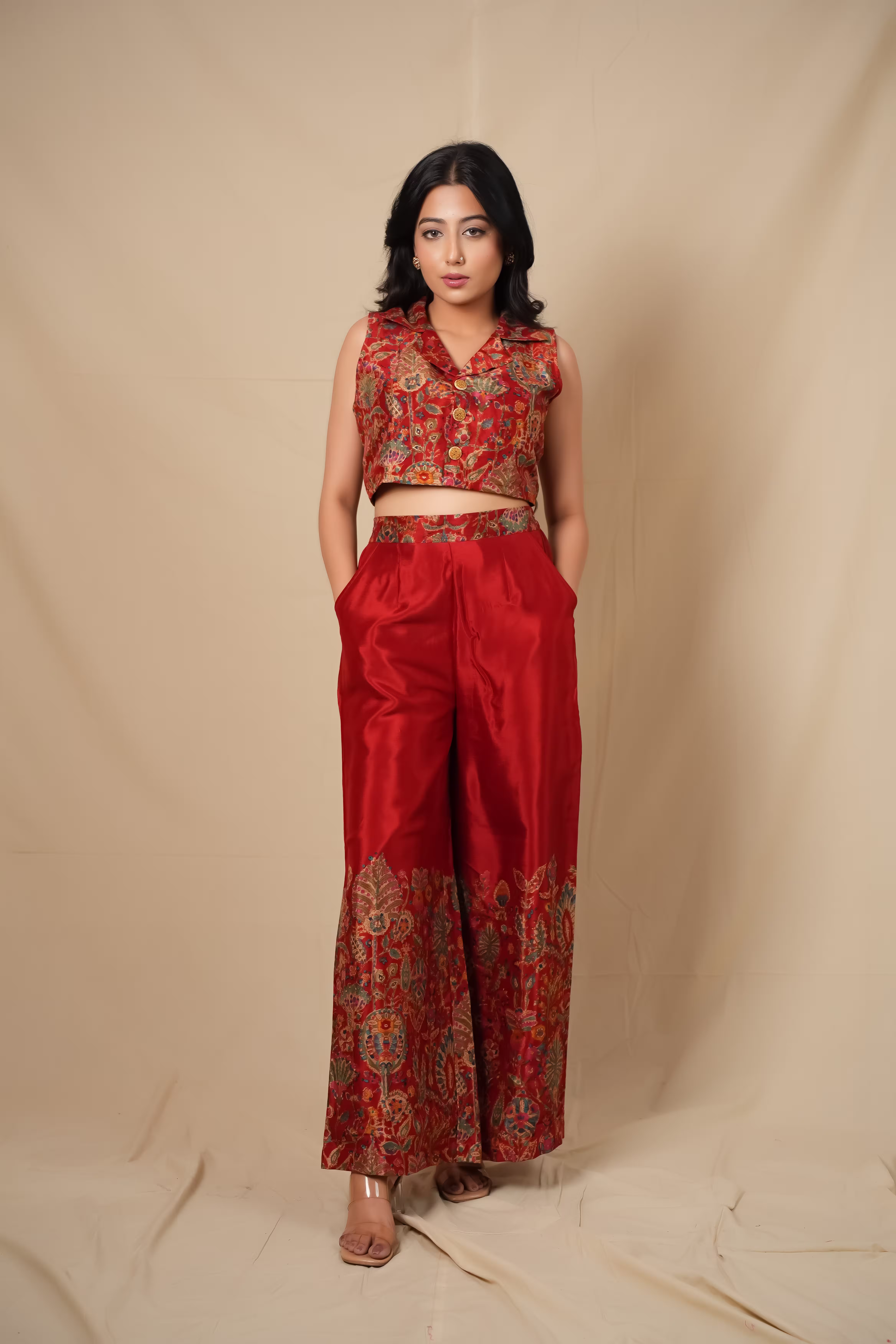 The sleeveless cropped top is tailored with a structured fit and statement collar neckline, giving it a modern, confident edge. Paired with high-waisted, flowy palazzo pants, the ensemble creates a beautifully balanced look—effortlessly blending structure with fluidity.